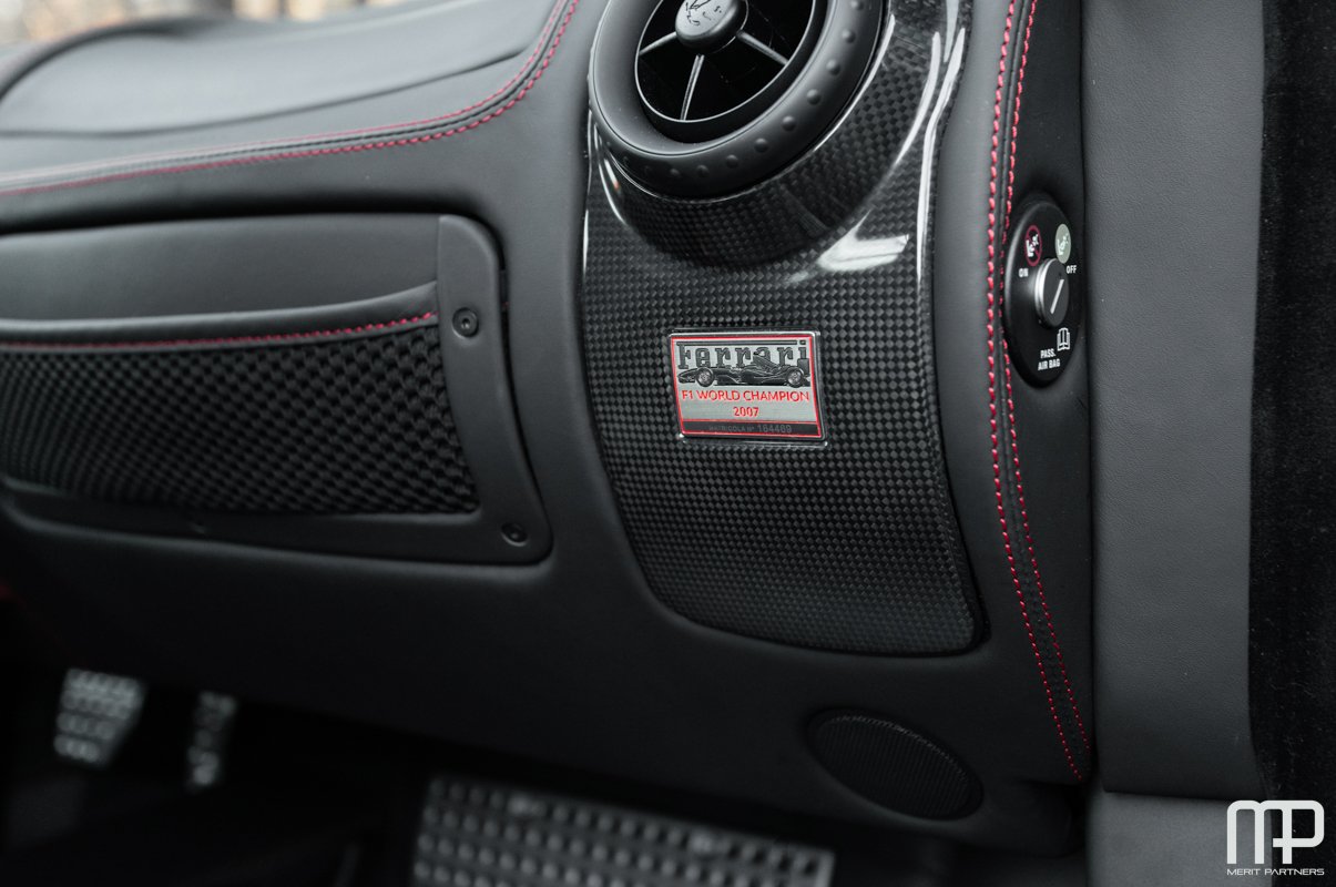 Merit Partners is pleased to present this 2008 Ferrari 430 Scuderia in Rosso Corsa and Grigio Corsa stripes over black interior. This stunning Scuderia features a full leather interior with leather bucket seats as well as red deviated stitching on the seats, center console, and dashboard. Also equipped with the Carbon Package, this car looks even more aggressive with its carbon mirrors and full carbon engine bay. Both the F1 actuator and AC compressor were replaced in July of 2020. In preparation for listing, the car was fully serviced and had a clutch reading of 17% used. The current owner has installed PPF on the bumper, hood, front fenders, rear fenders, mirrors, and ΒΌ of the roof. Because the previous owner did not have clear bra there some minor pin-sized chips on the bumper. The interior of the car is in beautiful condition with very minor bolster wear and no scratches on the carbon. This is truly a top tier Scuderia. This Scud comes with a clean Carfax, two keys, books, air compressor, tool kit, car cover, and service records from the current and previous owners.